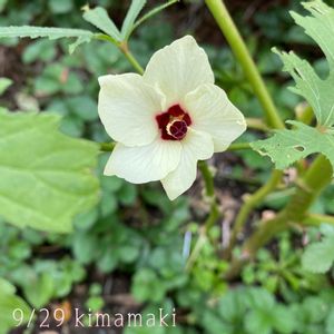 <自道投稿>おはようございます、小雨模様の天気です、こまめに咲いてました?「オクラ」の花です、少し前にきゅうり苗を片付けたら秋の陽光があたるようになりました😃実はちょこちょこ収穫してましたが、花は今日🤳しました😀花の隣の実は収穫して、納豆に刻んで(ゆで)入れて食べる予定です😋台風🌀来ないでね😅