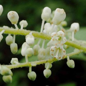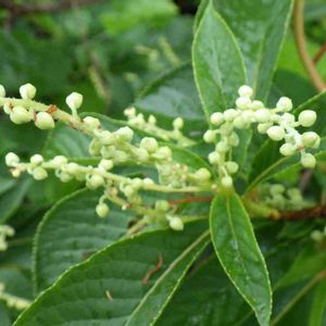 令法(リョウブ) リョウブ科リョウブ属の落葉小高木。山地や里山に生え、庭や公園にも植えられる。樹皮が薄く剥がれてまだら模様になるのが特徴。葉は倒卵形で鋸歯がある。花期は6~8月。枝先の総状花序に白い小さな花を多数つける。果実は蒴果、球形で毛が密生して下向きに熟す。種子は楕円形や狭球形で多数入る。 リョウブの柔らかな若葉を茹でて干すと長期保存がきくので昔は保存食とした。それを飯に混ぜてリョウブ飯にすると、飯のボリュームを増すことができ、貧しい山村の家では大助かりだったという。奈良時代から平安時代の律令制の時代に、田畑の面積に応じてリョウブを植栽し、飢饉に備えて若葉を乾燥させて貯蔵する官令が出されたことから、法を意味する『令法』が転じてリョウブの名が生まれた。長い花序を『竜尾』に見立てたことが由来とも。 出典『里山の花木 ハンドブック』『樹木の名前』