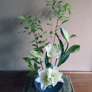 今回のテーマは“床上がり”だったので、上からの目線を意識しました。 リョウブとテッポウユリで夏らしい作品になりました☀️