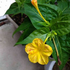 北側のベランダの鉢に蒔いた黄色の絞りのオシロイバナがさきました💖 少し絞りになってます🥳