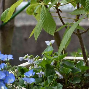 真ん中がフキカケスミレ 4年前に拾った実から育てているとちの木とネモフィラ とちの木はようやく新しい葉っぱを広げたばかり 春、春、春が来たよ~!