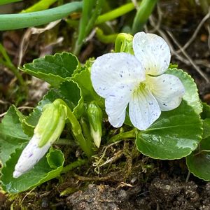 フキカケスミレ (フレックルス) 最初に見た時はまだ蕾でした。雨降りだったので土がたくさん付いてるのかと思いました😄 葉は光沢のある心臓形🍀 🌿スミレ科