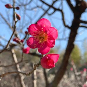 府中市郷土の森。青い空に紅白の梅が満開🌸イイ香り。紅千鳥。