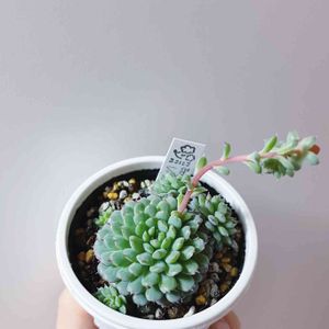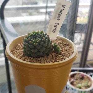 新しくお迎えしたビンセントカトーさん✨コロコロまぁるくて可愛いです💖うちの旦那ちゃんがYahooかどこかで半額クーポン貰ったとかで多肉欲しいのないの?と聞いてくれて買ってもらいました🥰 かなり小型のエケベリアで 別名グロブローサ… グロブローサは暑さに弱くかなり夏越しが難しいと聞いたことがあります あなた、グロブローサだったの😰素人の私に育てられるんだろうか… 親よりひと回り小さい子株が2つ付いてたので速攻株分け 保険株にしました。子を取ってもまだ親の周りには小さい子株が6〜7個 地中に埋めてしまった子株も4つくらいありました 流石に小さ過ぎて株分け出来ないけど夏までに育って株分けさせてくれないかなぁ🤔我が家は😺にゃんこがいるので夏は24時間エアコンつけてる🎐 家に入れるべきか…