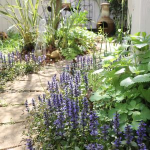 アジュガが咲き始めました💜 以下、写真とは関係ないんですが今朝の出来事。 雨でちょっと庭に出てない間にキンモクセイに異変が…先端の若い葉が軒並み茶色く萎れてる💧 よく見てみると居ました、ハマキムシ🐛 調べてみたらマエアカスカシノメイガの幼虫っぽい。そういえばジュディオングさんみたいな半透明の小さいガが飛んでた記憶があります💦 つるバラ群舞と近くて鬱蒼としてるのも良くないと思い、キンモクセイの枝を切ってだいぶ透かしました😣