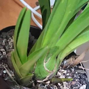 テーブルシンビジウム。 花後の株で、正直扱いが分からない。 子株だろうか🙄❓ あちこちから出てきた。 後ろからも何やら出てくる気配。 ホントは水苔に植え替えたいのだが。