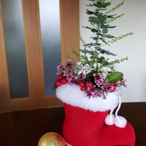 今日の花遊び X'masバージョン 100均のサンタの長靴に飾ってみました♪ ミモザを🎄に見立て 星咲マラコイデス ビックベリー イベリス スノーサーファー オアシスに刺しました♡ 雰囲気出てるかしら?