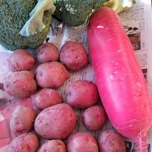 産直から 初めてのおじゃが ♡アンデス赤♡ 果肉は黄色でポテトサラダにピッタリでした♡ 大根も赤でも、ピンクでもなく、オレンジがかった鮮やかな赤です。 此方はお漬物に😋