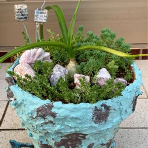 この最初に頂いた偽海葱は、全然大きくは成ってないのですが、元気そうです。 以前に作ってあった、このリメ鉢に、大量にある貝殻を、直接に貼り付けようかなと思案中です。