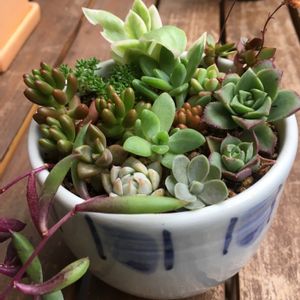 おはようございます(^^) 地元の陶器市で、可愛い陶器に入った多肉ちゃんをお迎えしました🌵 「多肉植物はおまけです」のコメントとともにたくさんハンギングされてました😅 名前は…わからないのばかり…💦 器は、愛媛の砥部焼です😊