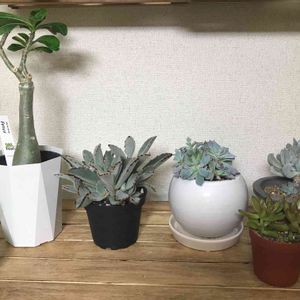 百均多肉ハント。 真ん中のみアデニュウムと表示あり、両サイドは観葉植物と。 多肉ちゃん…よね??