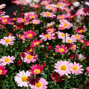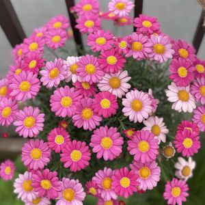こんにちは マーガレットストロベリーホイップ マーガレットホワイトモカ ストロベリーホイップは 日向でも日陰でも可愛すぎるいろんなピンク🩷で咲いてくれています✌︎ 途中でバッサリ剪定を行っていないので不揃いですが、このお花畑感も大好き🥰