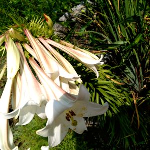 ギョキョッというほどの百合の花 真っ白だからシンテッポウユリだと思いますがよく分かりません 🔍シンテッポウユリはタカサゴユリとテッポウユリの交配種 🔍帯化現象とは茎が平たくリボン状に変化して数え切れないほどの花を付ける奇形の1種