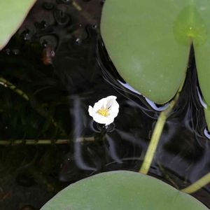 おはようございます 小さな水草の花 (オオカナダモ)? 今日の雨で沈みそう(^_^*) メダカは睡蓮の下に隠れていました 〈昨日、横浜で撮りました〉