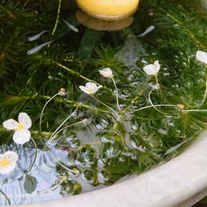 メダカの水鉢になんか白い物が浮かんでいると思ったら、オオカナダモ(?)の花でした。❁︎ このビオトープの中に5年以上いてるけど花が咲いたのは初めて。❁︎👀 繁殖力が強いので時々間引いては燃えるゴミとして捨てています。外来種なので、田んぼやその辺の水路には捨てないようにしましょうねー。