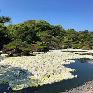 GW明けに島根県の大根島まで行ってきました。 これは由志園です。 ちょっとだけ赤系の花が池に浮かんでます。