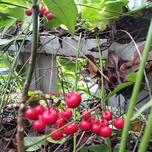 紅白万両 小鳥の置き土産 色づきました😉 春になると、庭のあちこちで芽吹きます🤗