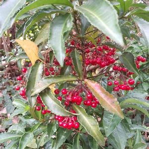 真夏に花を咲かせ新葉を出し古葉を落とします。 結実した実も充実してきました。 斑入り、紅白(実が)、ちぢれ葉の珍品です^ ^笑 万両