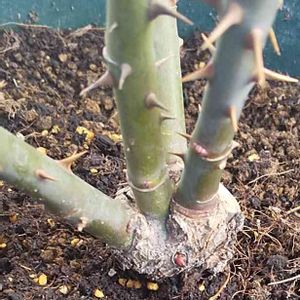 2週間ほど前に剪定と植え替えをしたブロドリー 根本に赤いポチ!ベーサルかな😲 バラの家の土 オーガニック元肥 根を育てる肥料 を規定の量入れました