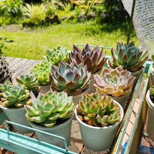 お一人様多肉ꕤ*。゚ ワゴンの中のお一人様多肉ちゃんたち この場所は朝日があたるいい場所 朝でも日差しがつよい💦 最近は、新しく多肉ちゃんをお迎えすることはなく、今いてる子たちで楽しませてもらっています✨ ワゴンの中のお一人様も根元にお子ちゃまがたくさんでていたり、子株を一人立ちさせたものが大きくなってきたりと楽しみいっぱいです♪ (๑´ㅂ`๑)♡*.+゜
