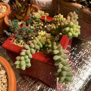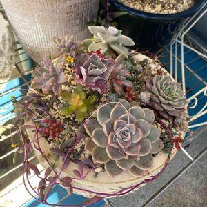 秋頃に作って、風で飛ばされて、バラバラになった寄せ植え😰 その後やり直していましたが、隙間が目立ってきたので、新たに少しつぶつぶ足して見ました。 ネルソルで作ってあるので、足すのも大変💦穴開けるような感じで😓 根ついてください🙏