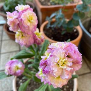一重のストックもずっと咲き続けてくれてます😊ツボミもゆっくり成長中✨後ろのローズマリーもお花咲いてます♪