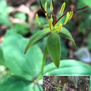 ツクバネソウの花です😍 内花被片がなく外花被片のみでそれが緑色とこれまた地味、下に反り返ります。 とは言え、花柱は大きく4裂、葯は鮮やかな黄色とここだけは目立ちますね😆