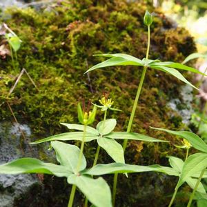 ツクバネソウ(衝羽根草)の実(黒紫色の実) ユリ科ツクバネソウ属 多年草 この実とガクの姿が羽根つきの羽に似ていることから名づけられた。 「ツクバネウツギ」「ハナツクバネウツギ」「ツクバネ」の名前も同じ意味からだが、実が黒いのはこのツクバネソウだけ。