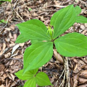 ツクバネソウ(衝羽根草) 🌿シュロソウ科 ツクバネソウ属 ✽高さ20〜40cmの多年草 ✽長く伸びる根茎の節から直立する茎を出す ✽茎頂にふつう4個、時に5〜6個の柄のない葉が輪生する ✽花に花弁はなく、がく片4個、雄しべ8個、花柱が4個ある ↓もう少し成長すると萼片(外花被片)が垂れ下がります🌱