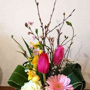 桜アレンジメント 啓翁桜、小手鞠、フリージア、チューリップ、カンパニュラ、薔薇、トルコギキョウ