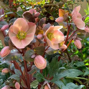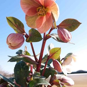 1月半ばから咲き始めたクリスマスローズの最近の様子です。お顔が正面向きです。咲き始めが桜貝のようなピンク、だんだんピンクが濃くなっていき、グリーンがのっていきます。 足元にまだ蕾がたくさんついています。