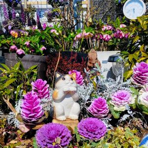 紫系の寄植えと葉牡丹達🌿 トランプ兵のガーデン雑貨を移動して飾って楽しんでます🪴