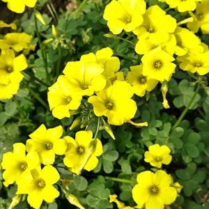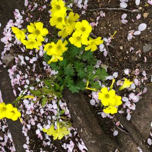 🪴草花たち その373 オオキバナカタバミ(大黄花酢漿草) 学名のオキザリス・ペスカプラエとも呼ぶようです。 木の根元に広がって咲いていました。 黄色と言っても優しい黄色です。(*´˘`*)♡ 🏷月曜日にビタミンカラー ☀️ ✽.。.:*·゚ ✽.。.:*·゚ 🌳✨✽.。.:*·🍃゚ ✽.。.:*·゚ ⌘ メモ ⌘ 🔸科名・属名 カタバミ科カタバミ属 🔸学名 Oxalis pes-caprae 🔸英名 African wood sorrel Bermuda buttercup Buttercup oxalis Cape cow-slip Cape sorrel Englishweed Large yellow soursob South African wood sorrel Yellow flowered oxalis Yellow sorrel 🔸別名 キイロハナカタバミ(黄色花片喰) オキザリス・ペスカプラエ オキザリス・セルヌア 🔸由来 *オオキバナカタバミ 黄色い花を見せる大形のカタバミであることに因む。 *Oxalis ギリシャ語のoxys(=酸っぱい)が語源。 *pes-caprae 「山羊の足」の意で先割れを意味。 🔸原産地 南アフリカ 🔸花期 4月~9月頃 🔸花色 黄色 🔸結実 殆どしない 🔸特徴 多年草。草丈15~30㎝程度。 明治時代中頃に観賞用として渡来。 1961年に鹿児島県で帰化が確認され、各地に野生化。 葉は全て根生葉であり、3出複葉となり、小葉は 倒心臓形で表面に紫褐色の斑点が見られる。 花径は1.5〜3cm。散形花序。