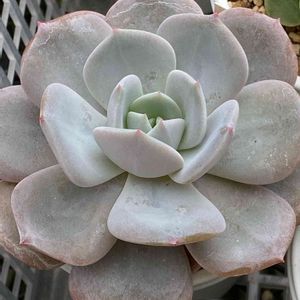 エケベリア(Echeveria) プリドニス×ラウリンゼ 全体的に白っぽい緑色で葉先が赤く綺麗な苗です🙂 2年目になりますが大分大きくなりました👍 まだ大丈夫かなと思ってましたが連日の猛暑で多肉の葉焼けが出始めました😅 急遽遮光初めました💦 皆さんも気をつけてくださいね🙏