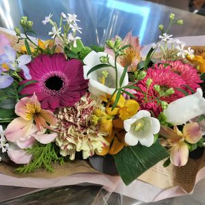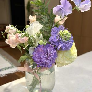 こんばんは🌙 今日も気温が上がり暖かかったです☀️ 娘からのお花です💐 薄い紫とピンクと白の色合いが優しい雰囲気で癒されます☘️ 結婚式💒で着た色ドレス👗と同じ色合いだなぁと何十年前を思い出しました☘️