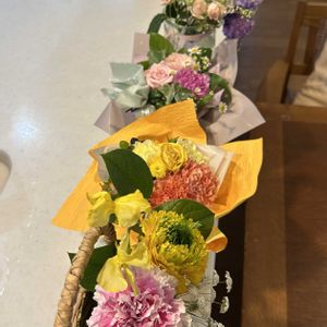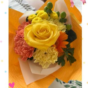 2枚目です☘️ おはようございます☀️ 妹が誕生日のお祝いに贈ってくれました🧡💛 私の誕生日の次の日が主人の誕生日ですので、私たち2人に贈ってくれています🌼 ビタミンカラーのお花は気分が明るくなりとっても嬉しいです☺️