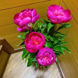 生けたシャクヤクがなかなか開きません 一番最初に咲いた花はよく開きました (右の写真) ポンポンと咲いてくれるかと待っていましたが、開かない😅 一番最初に咲いた花が、もう限界かなと思い、写真を撮りました📸