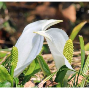 ミズバショウの花🤍 まだ、少し早かったです。 ・サトイモ科の多年草 ・春の高山植物 白い花びらのようなものは、花弁ではなく、苞(ほう)と言って花を保護するため、葉が変化したものだそうです。白い苞の中にある小さな穂のようなものが花なんです。