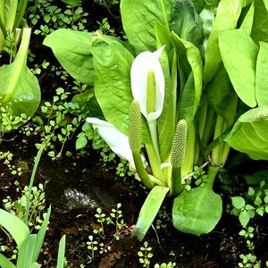 ミズバショウ(水芭蕉) 沼地に純白の仏炎苞がよく目立ちます😊 「夏の思い出」の歌(夏が来ーれば思い出すー・・・ミズバショウの花が咲いてーる🎵)が有名ですね😙