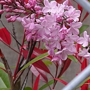 散歩道のお花 フェンスの向こうのライラックとベニカナメモチが綺麗でした✨💗❤️💚 🏷️今日のお花 🏷️ピンクワールドへようこそ 🏷️葉っぱ好き に参加します🎵
