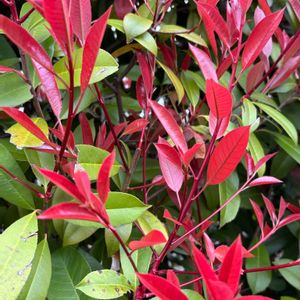ニカナメモチ(ベニカナメモチ、レッドロビン等の別名)です。 「目に青葉」ではなく「目に赤葉」ですが(笑)、春の新芽の葉っぱのみが赤色になります。(時間の経過とともに緑色の葉っぱに変化していきます)私の子供の頃には家の生垣に使われる事が多かったですが、最近はあまり見なくなりました。(1品種で2度美味しいコスパに優れた園芸品種です)(笑)