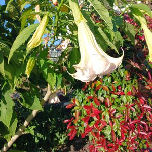 ①初めて歩いた場所ですが毎日仕事で通る所なのでもうおわりかけたエンゼルストランペットを撮りました。②はまたマユハケオモトですが元気にお花が咲いているのでパチリしました。