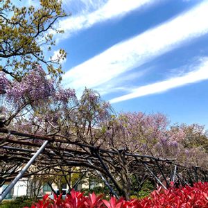 🌸藤の花と桜とベニカナメモチ🌸 先週、久しぶりに自転車でお買い物。 たまに外に出たら、 近所の藤の花が咲き始めていました。 藤の花の後ろでは、 まだ桜が頑張ってます😊 2020年4月撮影