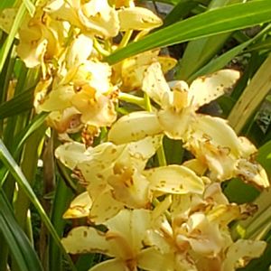 シンビジウム、満開! 全部で6鉢あります。亡き父が残したものです。育て方が良くわかっていませんが、毎年なん鉢かは咲いてくれます。 今年、鉢換え予定です。