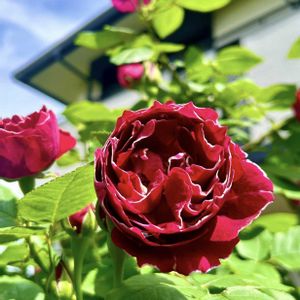 🌹オデュッセイア 花友さんから挿し木でいただきました。ようやく茎もしっかり育ち、花数も増えてきました🙌🏻 深みのある黒赤色から咲き進むと青みも出てきます。 花びらはひらひらとした波状弁咲き、ボリュームもあり、香りは強香でとっても魅力的なバラです❤️ ピンク系が多い私の庭では差し色になっています😍