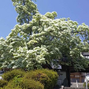 以前から気になっていた、福知山市に有る「頼光寺」さんの山門に咲く大きくて綺麗な「なんじゃもんじゃの木」です。 白くて細長い花弁のお花が集まって、とても綺麗です。 カーナビに電話番号を入れて向かうと、なんじゃ😨と言う道をナビゲーションされて…。慎重にバック。 大きな通りに戻って少し進むと、お寺への案内掲示が有りました🎵 遠くからもアッ❤️とわかるくらい存在感もありました。