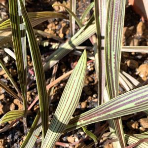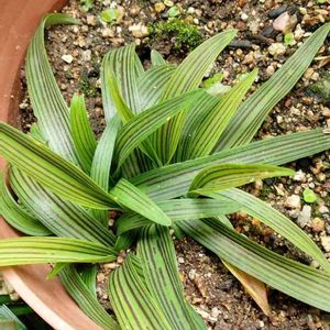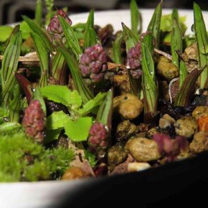 こんばんは。 縦縞模様の葉の中から赤紫っぽい色のゴモゴモした様な物が、花なの⁉️実なの⁉️ 購入時に付いていた🏷️のままにしていたら文字が消えてた😭 名前、教えて下さい。 追記、葉の長さは1cm有るか無いかの小ささです。