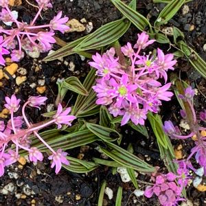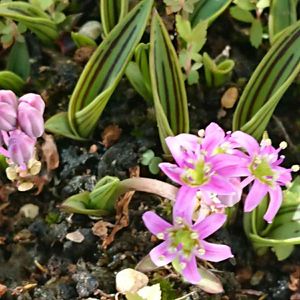 荻原さんで見つけました シマツルボです 背丈10センチほどの小さな花です 小さな球根がビッシリ詰まっていてポットから抜くのが大変でした😅