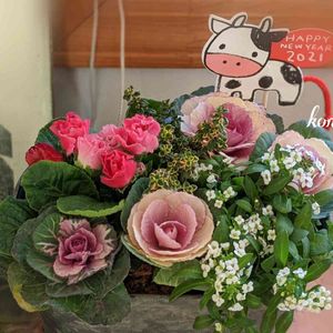 Jun.2021 New Year's flowers ダリア ストック 葉ボタン カーネーション 南天 キャベツみたいな葉ぼたん。 可愛い♡とても好き〜♡笑