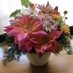 おはようございます🧚♀️🍃 今日は遅めの投稿҉٩(*´︶`*)۶҉ ҉ 朝からアレンジ作ってました🍒 今日は母の誕生日なので… 持って行こうかなと🎼💫💫 色んなハプニングがあってのとりあえず着地できたアレンジ🤭✨ ダメになった大輪のダリアの芯部分も向かって右下に入れちゃいました笑 母のなので…🌿 今日も心地好く過ごされて下さい🌿 穏やかに穏やかに💕